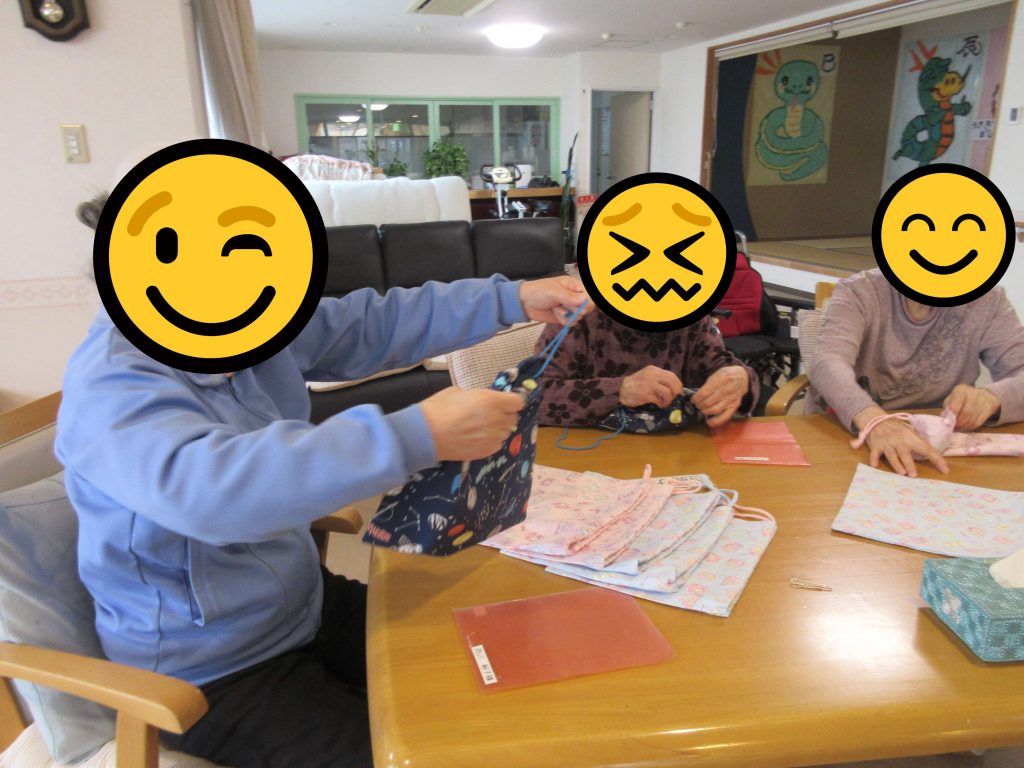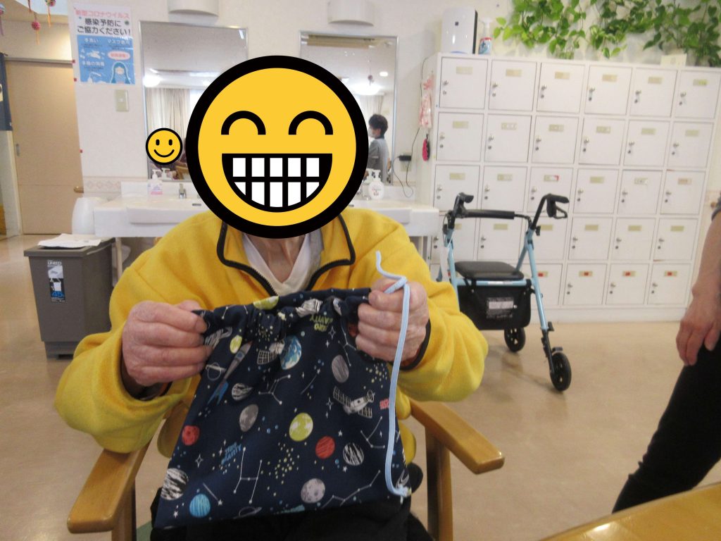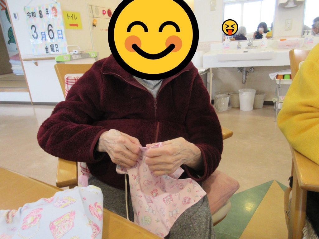 利用者様方から卒園のお祝いに巾着袋を作成中(^^♪